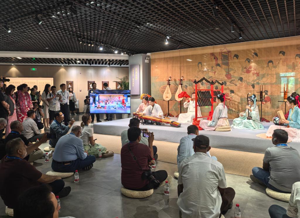 2025年7月26日,上海合作组织媒体智库峰会与会嘉宾在中国(河南)自贸区国际艺术品保税仓观看民族乐器复刻展演。新华社记者 袁月明 摄