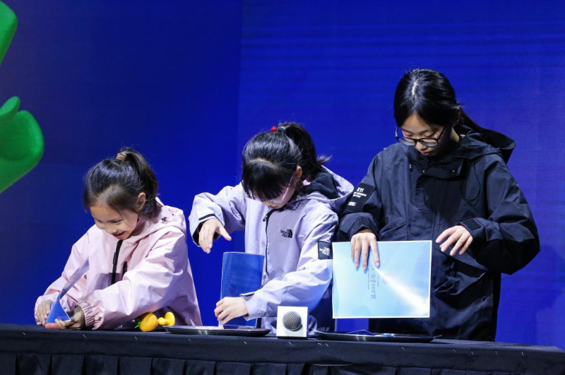 11月23日,小观众在浙江杭州举办的2024菠萝科学奖现场进行科学实验。新华社发